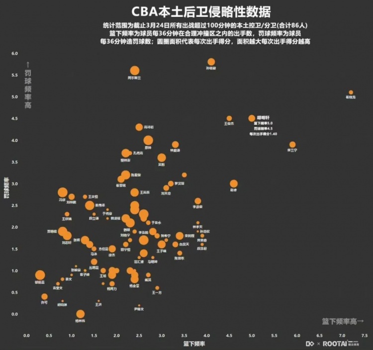 胡明轩本赛季的在进攻端的侵略性一直属于本土后卫的顶级,在篮下频率与罚球频率这两项数据上,只有崔晓龙能与他比肩。