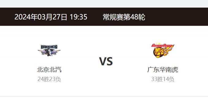 广东队下一场比赛时间:3月27日 19:35 北京北汽 VS 广东华南虎