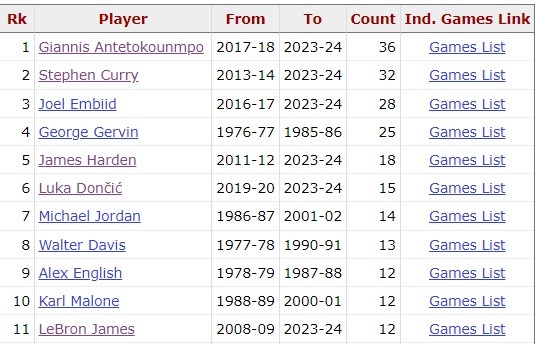 据统计,库里生涯至今共有33场比赛出场时间不超30分钟砍下30+,NBA历史仅次于字母哥(36场)。