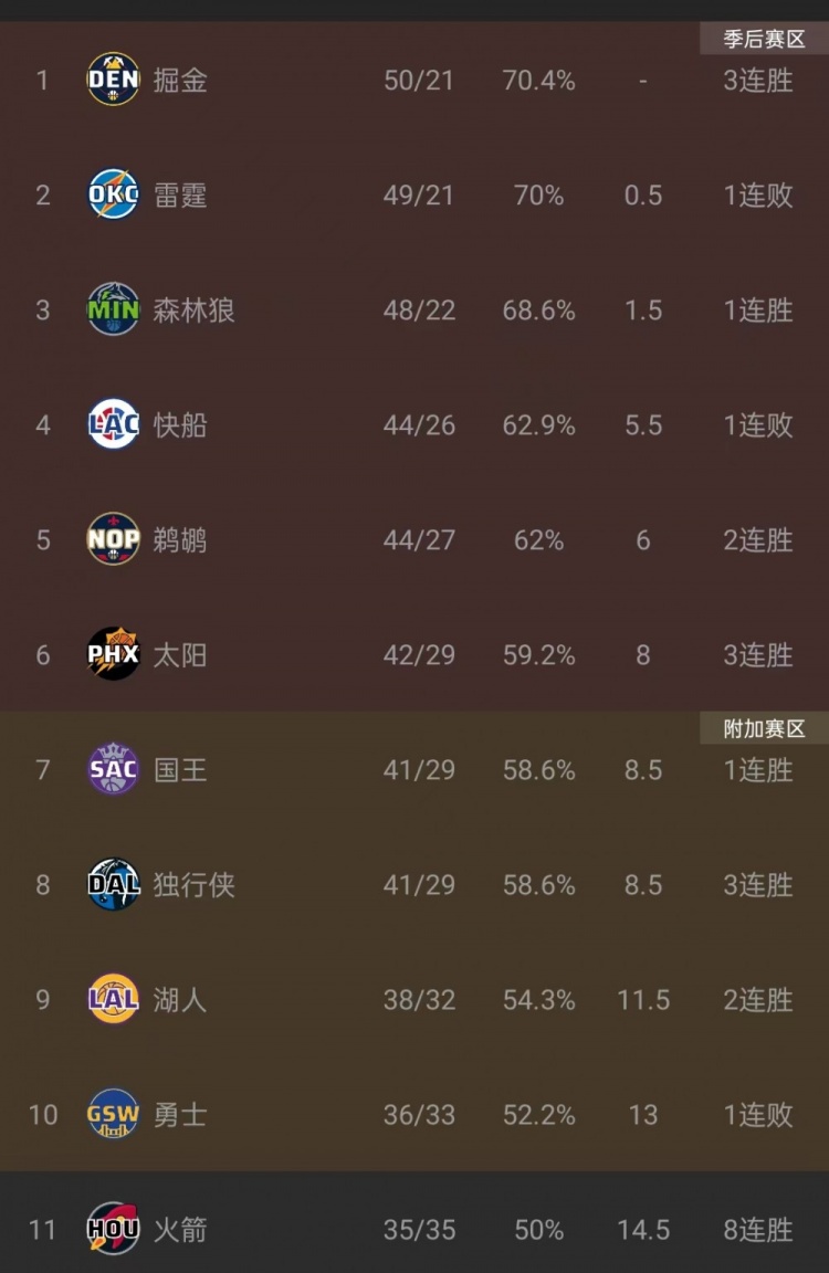 在输掉本场比赛后,雷霆战绩来到49胜21负,让出西部第一的位置。掘金(50胜21负)登顶西部。两队有0.5个胜场差。