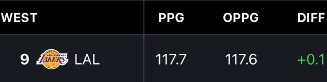 本场比赛过后,湖人场均得分为117.7,排在联盟第9;场均失分117.6,排在联盟第23。