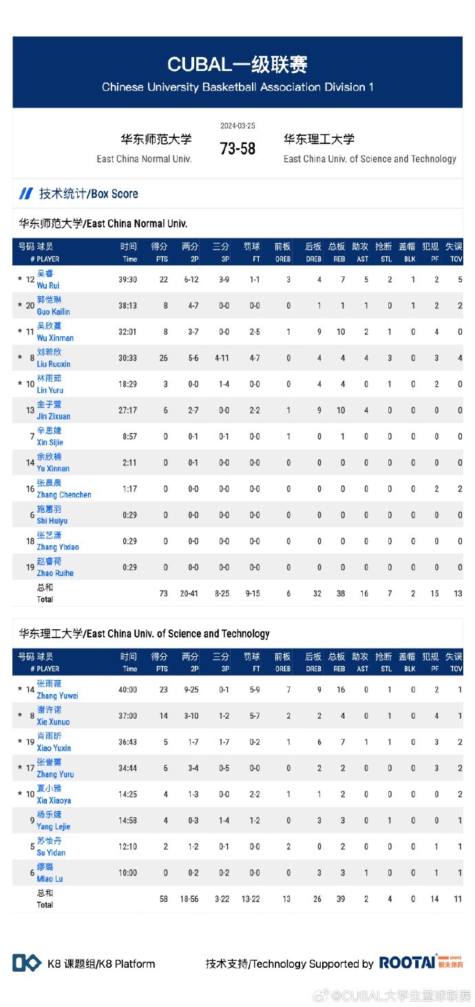 华东师大:刘若欣26分4篮板4助攻3抢断,吴睿22分7篮板5助攻2抢断,郭恺琳8分,吴欣蔓8分10篮板2助攻,金子萱6分10篮板4助攻