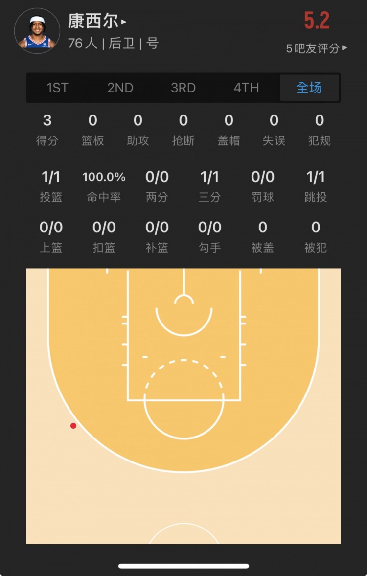 76人落选秀 里基-康西尔 出战2.4分钟