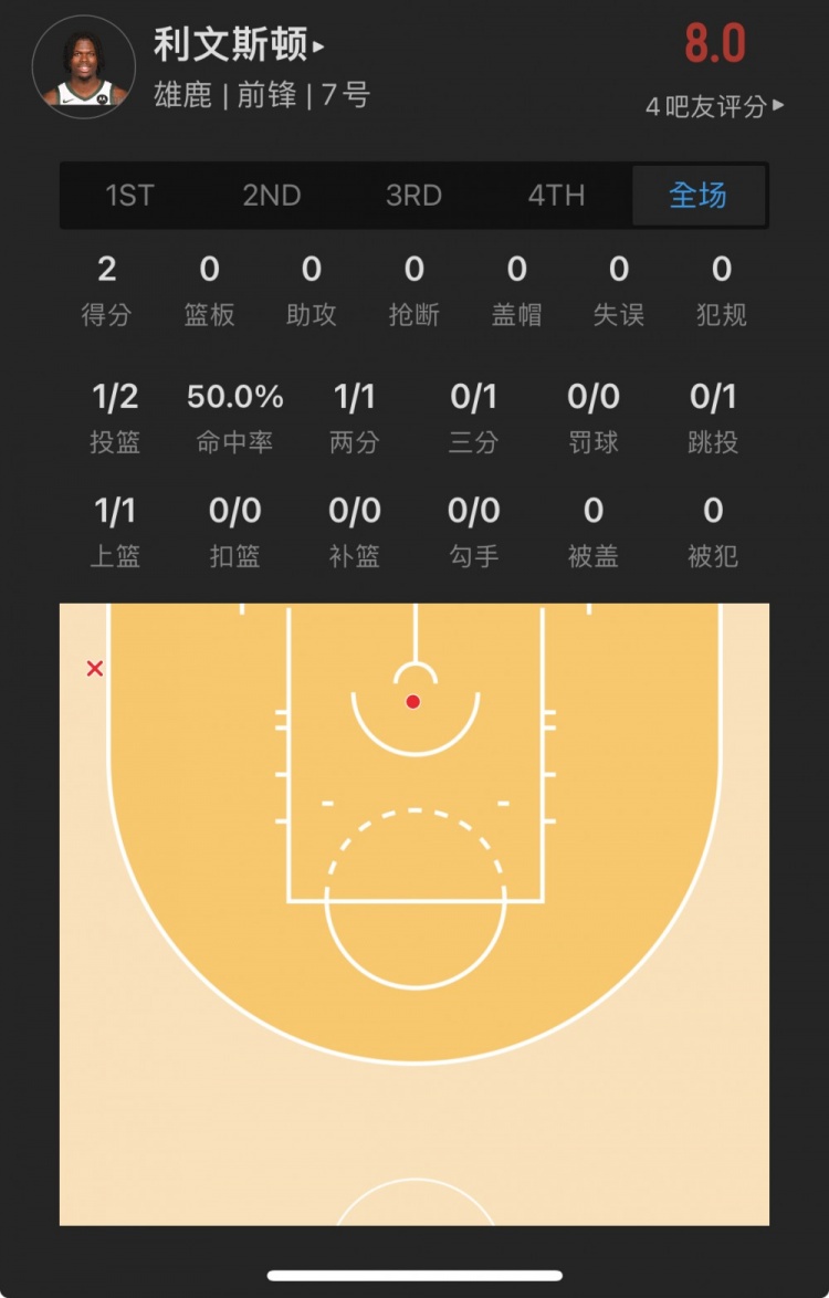 雄鹿58号秀 克里斯-利文斯顿 出战3.2分钟
