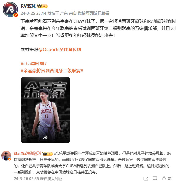 另一微博媒体人“StarXia澳洲篮球”在其微博下方评论写道:“余乐平或许职业生涯成就不如某些球员,但是他对儿子的培养思路,绝对是想法积极,目光长远的,而那几个代表了国家队那么多年,做过领导,做过国家队主教练的,让自己儿子青年队或者大学CUBA后选到去到自己队上,然后一起上班赚钱。这目光短浅的一系列操作,真感觉像在中国篮球这口枯井里投毒。”