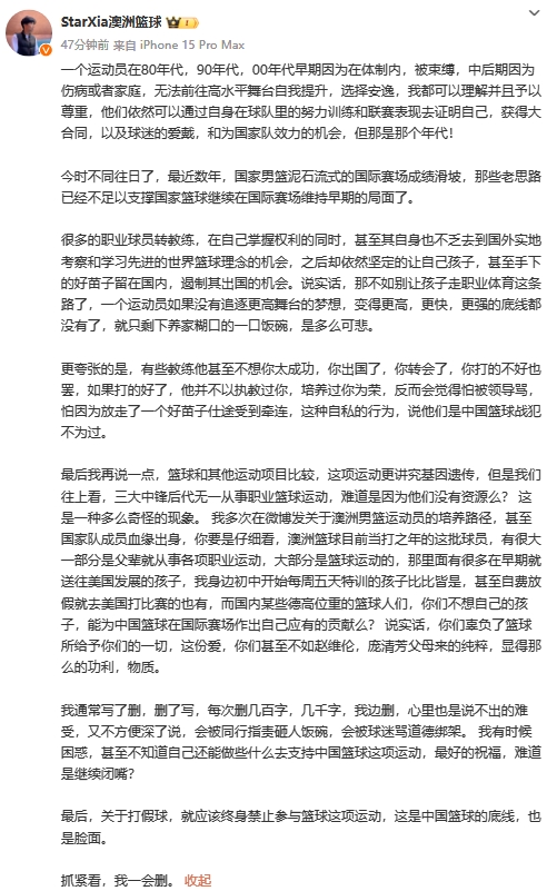 随后“StarXia澳洲篮球”再次更新微博发表相关个人感想,原文如下。