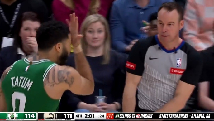比赛中,塔图姆对裁判蒂文抱怨判罚,此时,老鹰解说员吐槽说:“塔图姆的抱怨太多了,他以为他是谁?是凯特琳-克拉克吗?”
