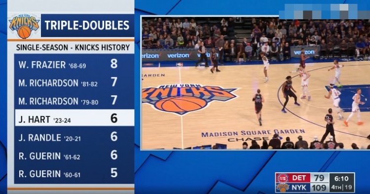 转播方晒出数据,哈特本赛季已拿到6次三双,排名尼克斯队史单赛季三双榜第3位。