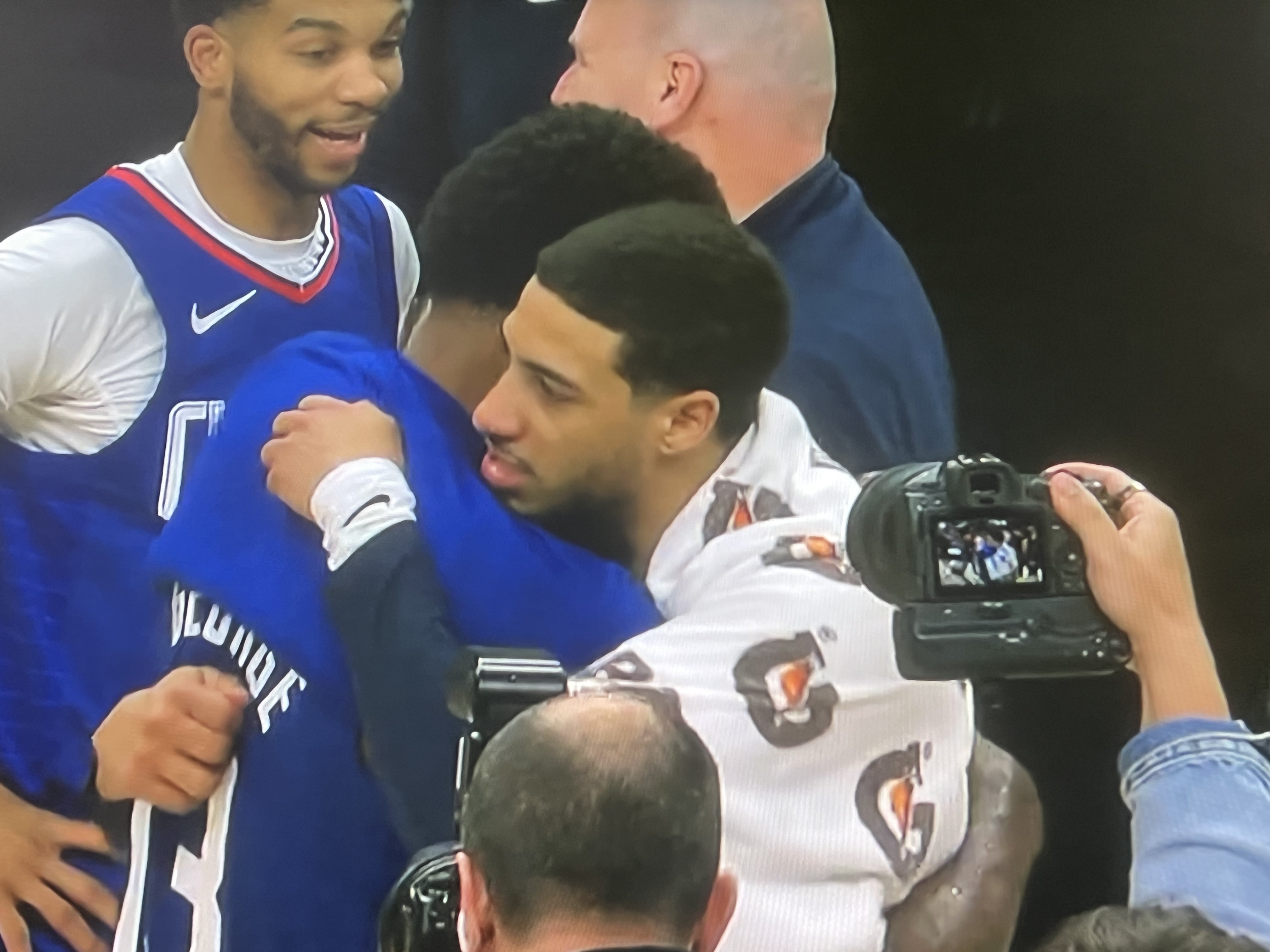老当家与新当家!乔治赛后与哈利伯顿拥抱畅聊