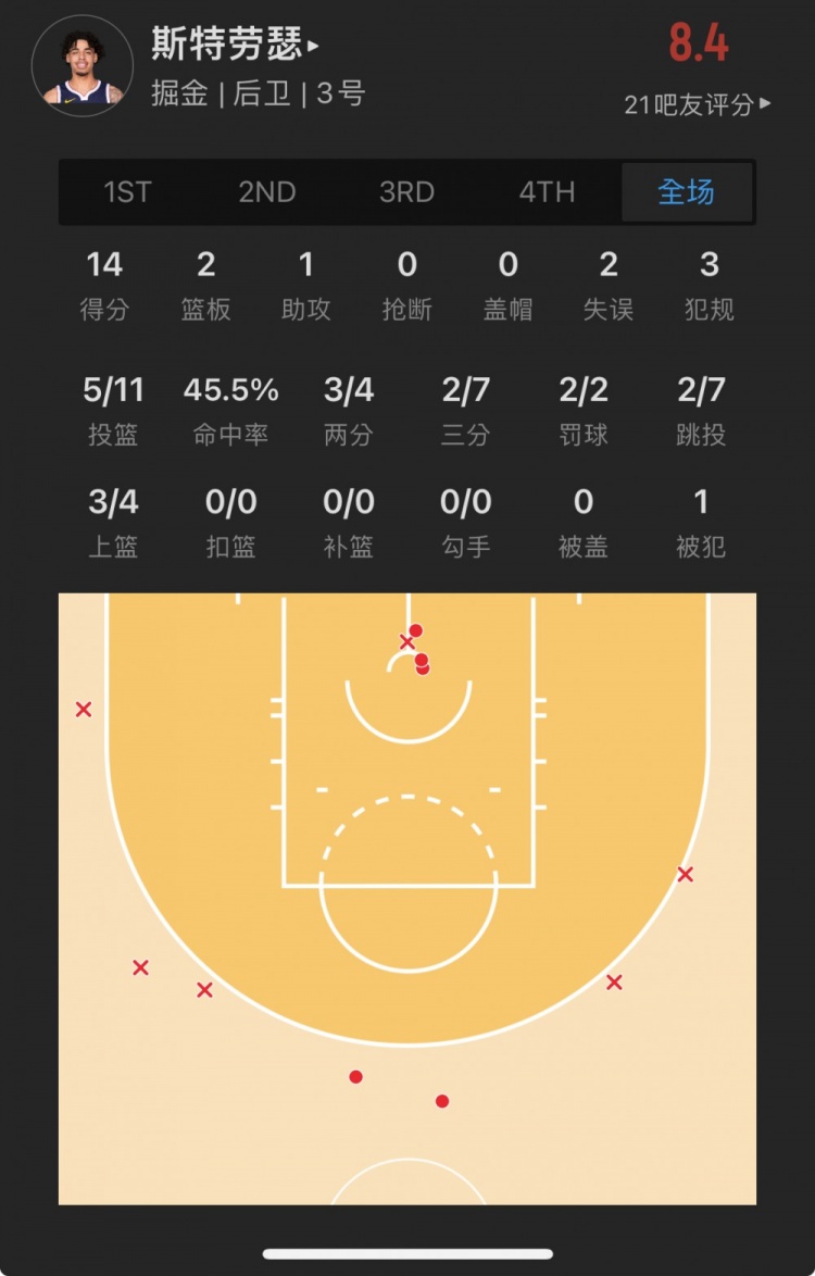 掘金29号秀 朱利安-斯特劳瑟 出战22.0分钟