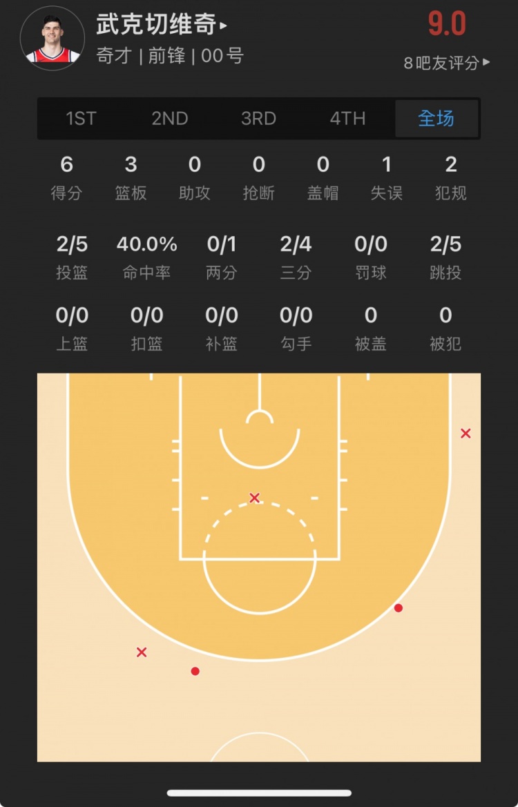 奇才42号秀 特里斯坦-武克切维奇 出战9.0分钟