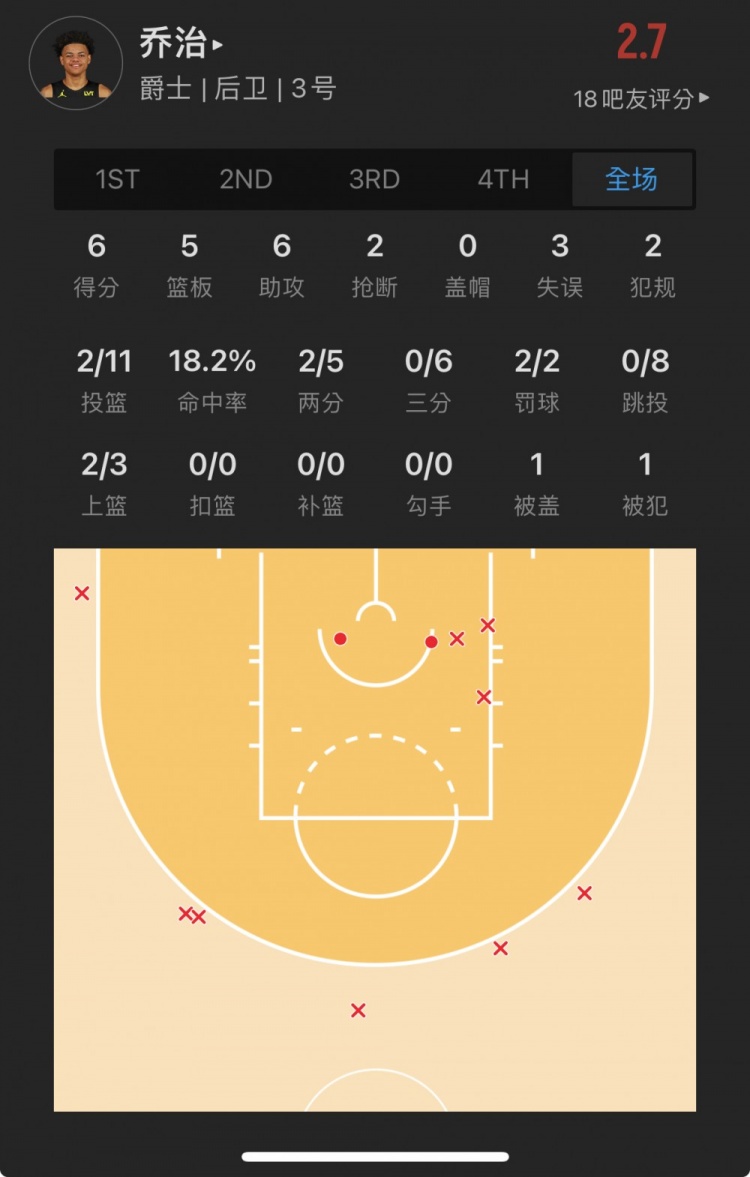 爵士16号秀 基昂特-乔治 出战35.1分钟
