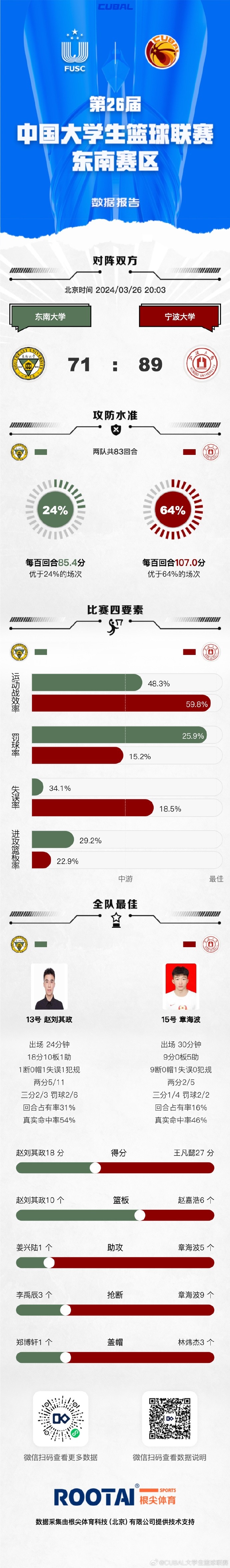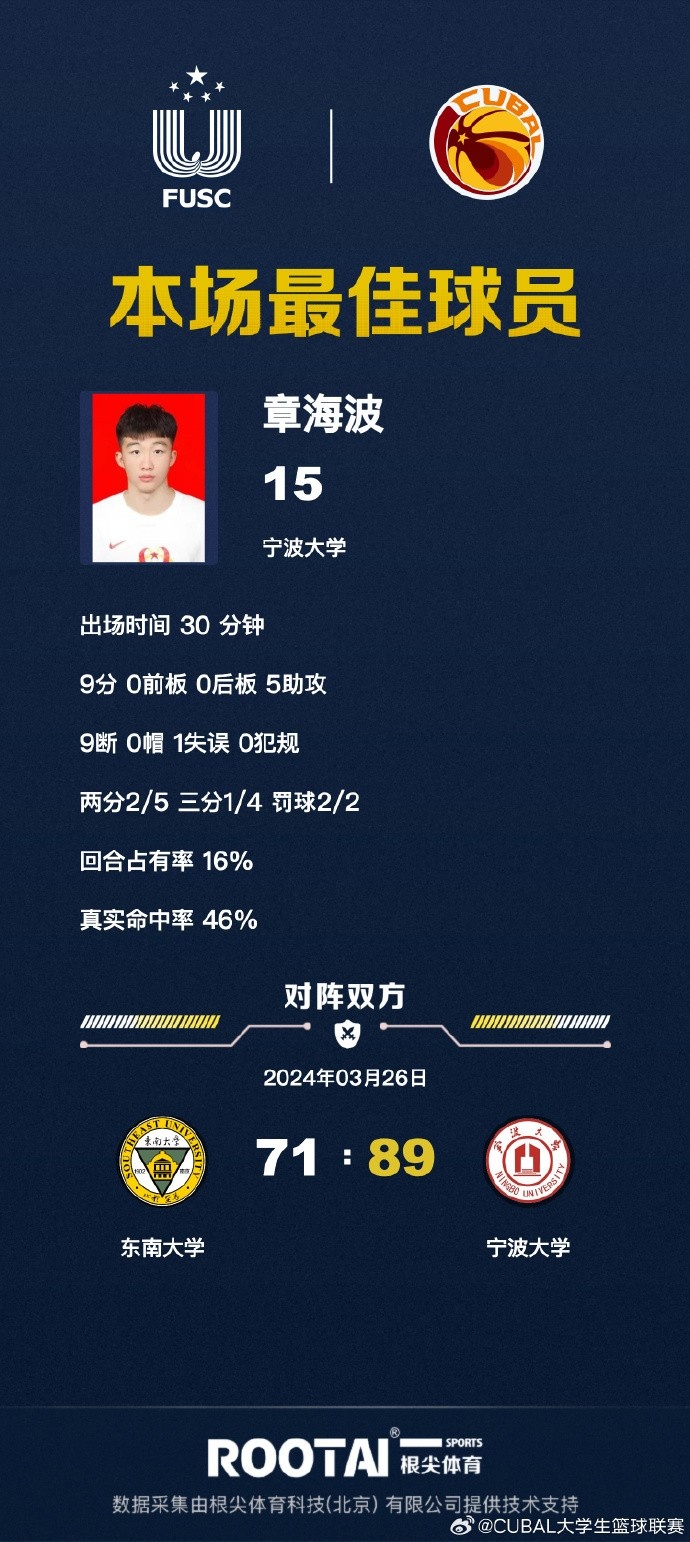 东南大学:赵刘其政18分10篮板、陈泽茏10分2篮板2抢断、祝子轩8分、陈子昂8分3篮板、郑博轩4分2篮板、毛棋锋6分3篮板、单林熙11分2篮板、姜兴陆4分4篮板。