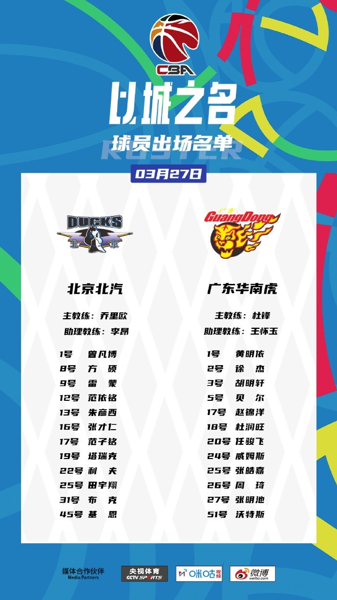 广东队:黄明依、徐杰、胡明轩、贝尔、赵锦洋、杜润旺、任骏飞、威姆斯、张皓嘉、周琦、张明池、沃特斯。