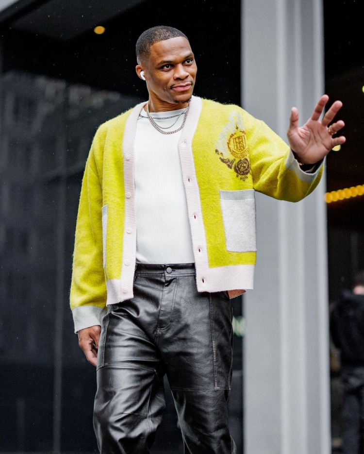 时尚潮男威少针织衫+黑皮裤+帆布鞋穿搭 质感十足