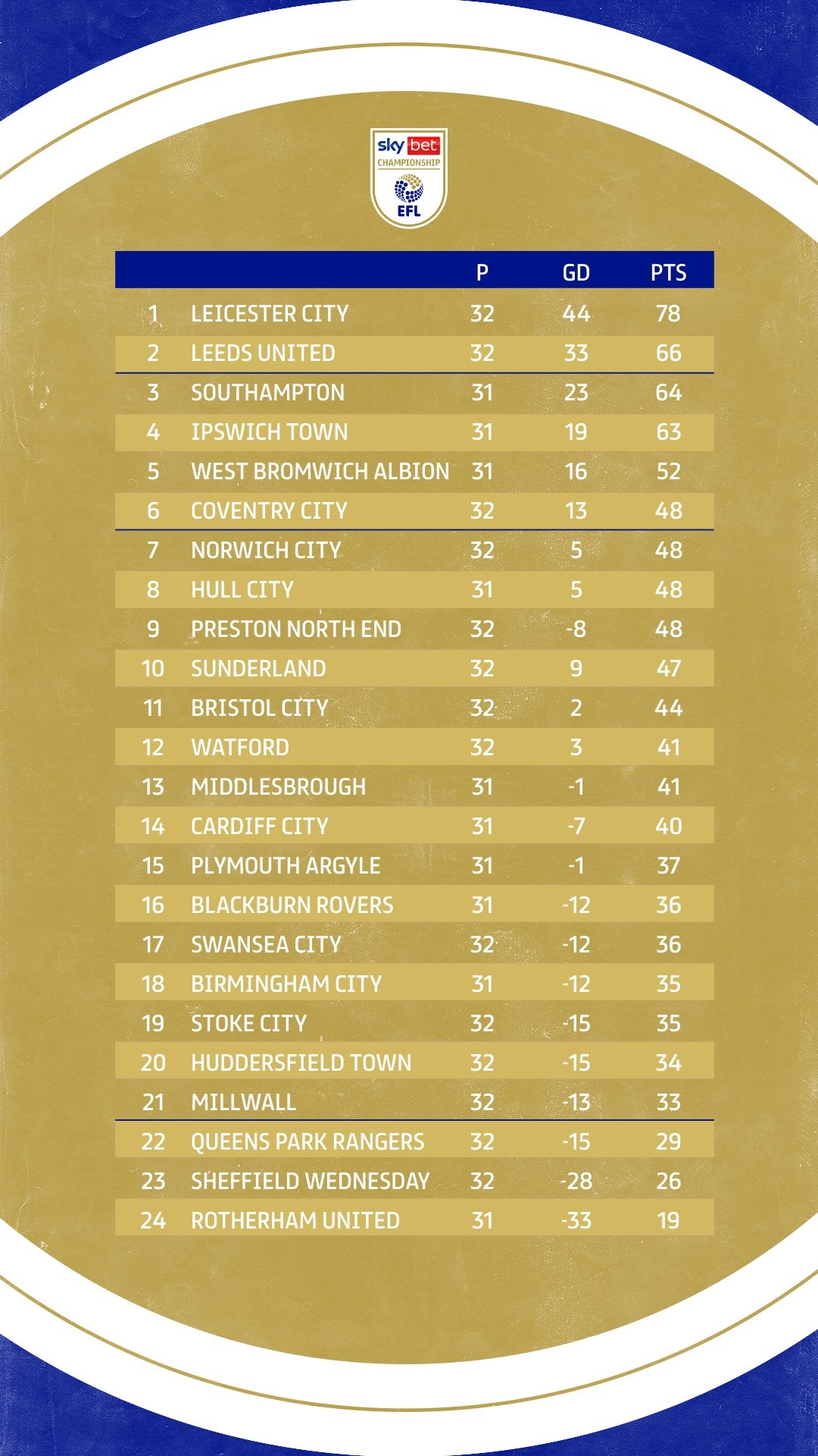 英冠第32轮战罢后的积分榜