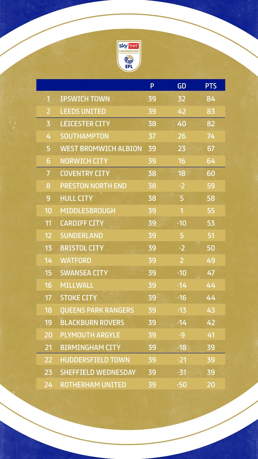 英冠积分榜,伊普斯维奇39轮84分从第三跃至榜首,利兹联39轮83分第二,莱斯特城38轮82分(少赛1场)跌至第三。