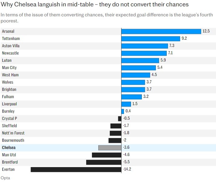 对于切尔西现在为何挣扎在中游,《电讯报》列举了另一项数据,那就是机会转化能力。数据显示,本赛季切尔西的预期进球数为50.6个,但实际进球数只为47,差额-3.6,这项数据在英超排名倒数第四,只比曼联、布伦特福德和埃弗顿更好。