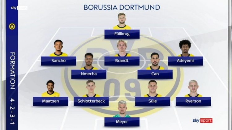 多特蒙德:迈尔;马特森、施洛特贝克、聚勒、雷尔森;恩梅查、埃姆雷-詹、布兰特;桑乔、菲尔克鲁格、阿德耶米