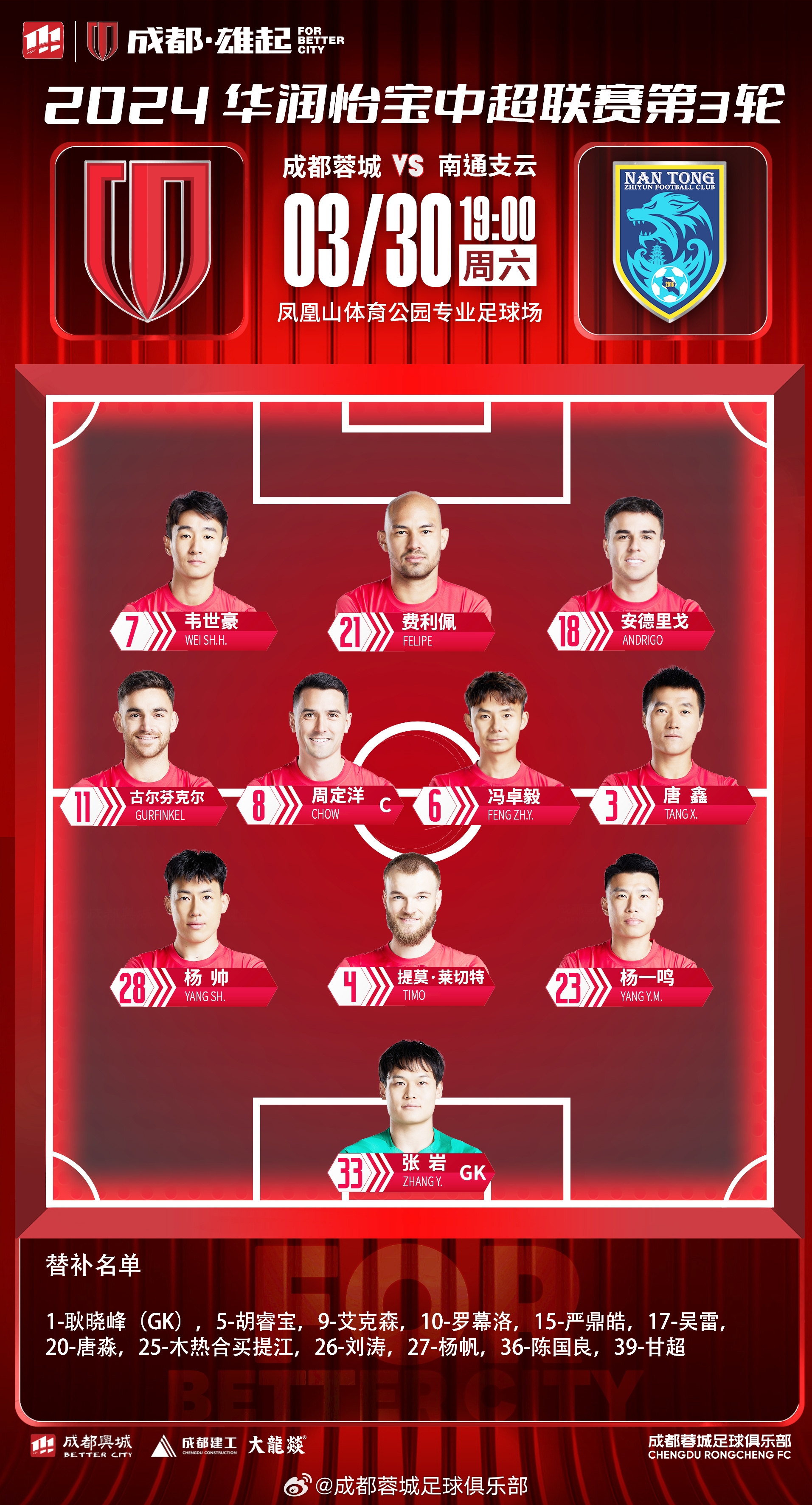 #ForBetterCity##成都蓉城vs南通支云# 今日首发名单出炉!
