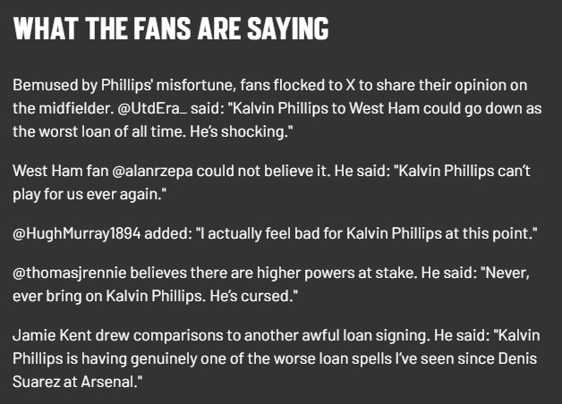 3月30日讯 英超第30轮,西汉姆客场遭遇纽卡斯尔逆转,租借效力于铁锤帮的凯文-菲利普斯替补出场表现糟糕。今年冬窗租借加盟以来,菲利普斯的发挥堪称灾难,国外球迷也对他开启了怒喷模式。