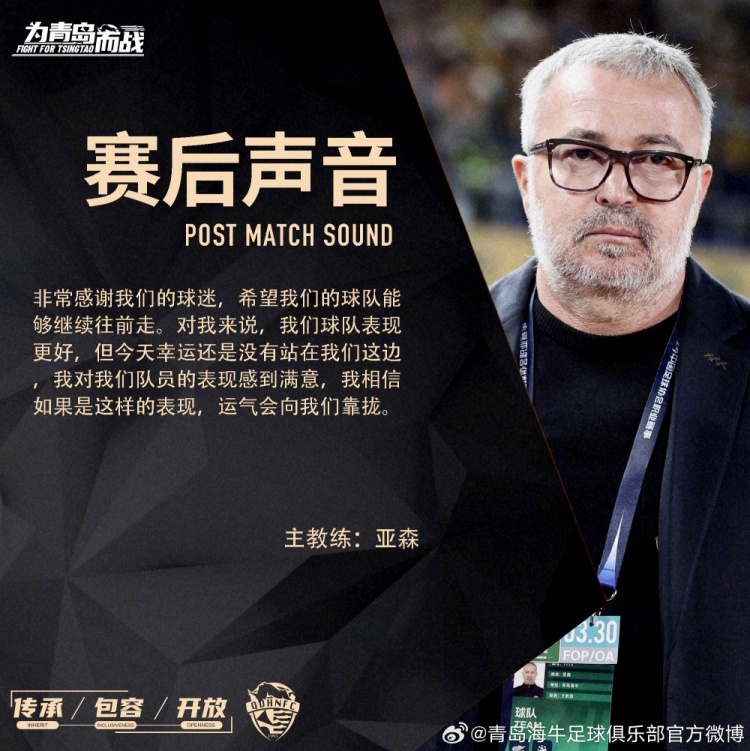 主教练亚森:非常感谢我们的球迷,希望我们的球队能够继续往前走。对我来说,我们球队表现更好,但今天幸运还是没有站在我们这边。我对我们队员的表现感到满意,我相信如果是这样的表现,运气会向我们靠拢。