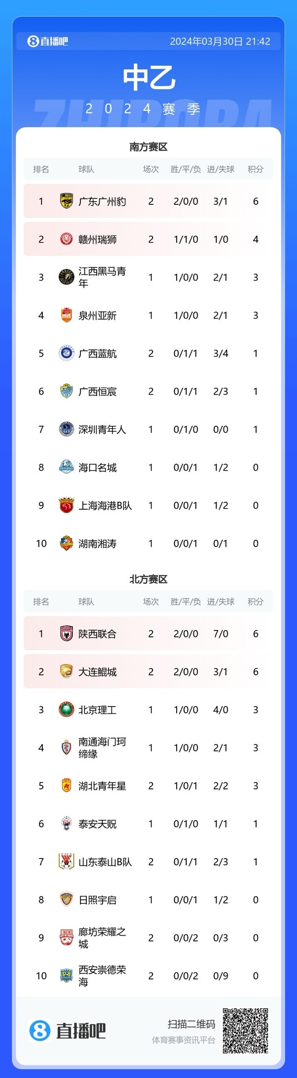 3月30日讯 中乙第2轮今日先赛5场,陕西联合和广东广州豹均取得两连胜,泰山B队1-2大连鲲城。