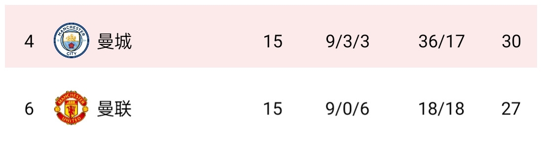 英超前15轮曼联仅落后曼城3分,现在落后曼城15分