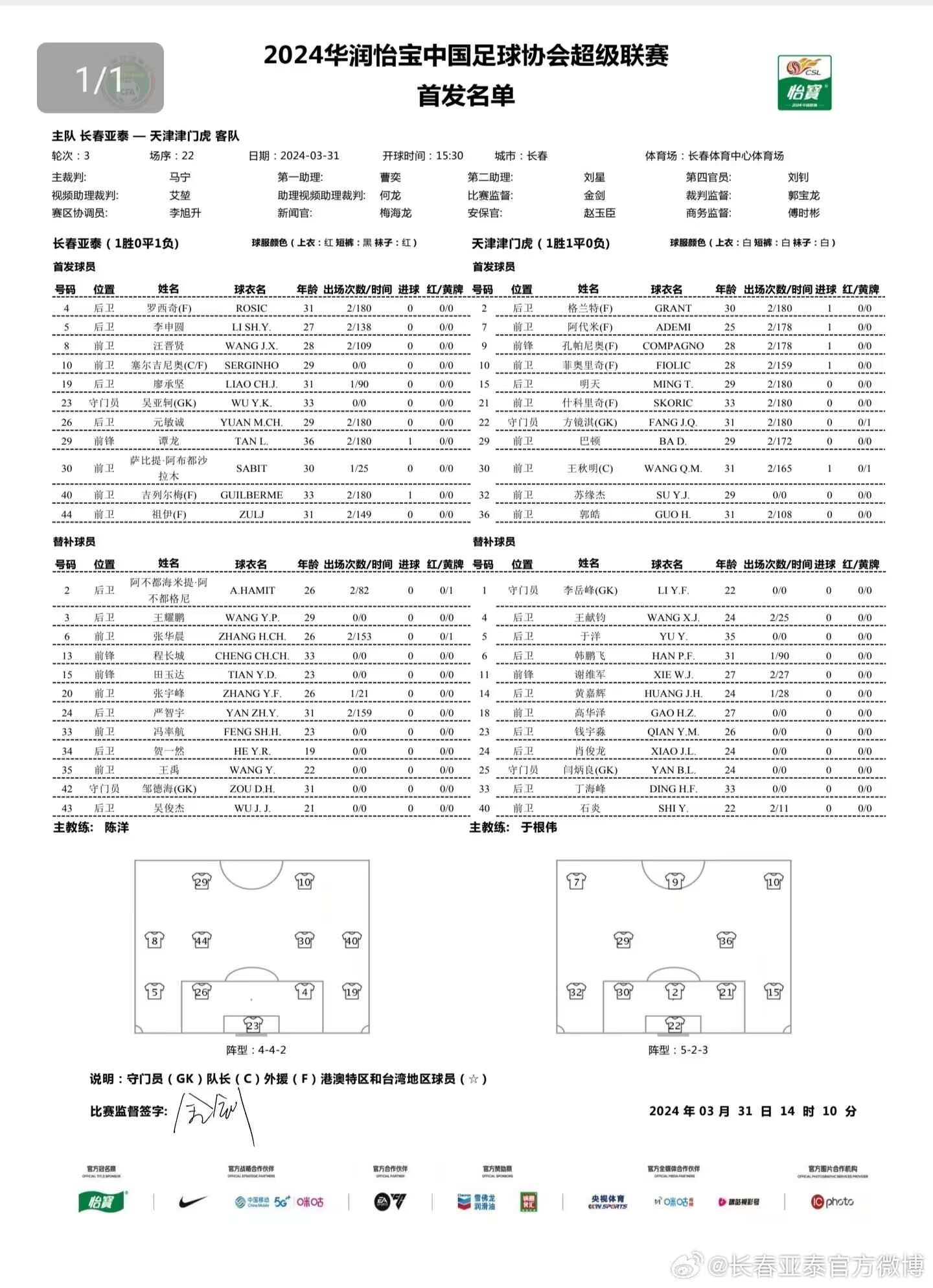 3月31日讯 中超第三轮,北京时间今天下午15点30分,长春亚泰vs天津津门虎,目前双方首发已经公布。