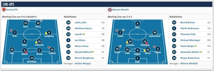 亨利在比赛第4分钟为阿森纳首开纪录,卡努第55分钟接亨利助攻将比分改写为2-0,拜仁由塔纳特、绍尔在56、66分钟各入1球。