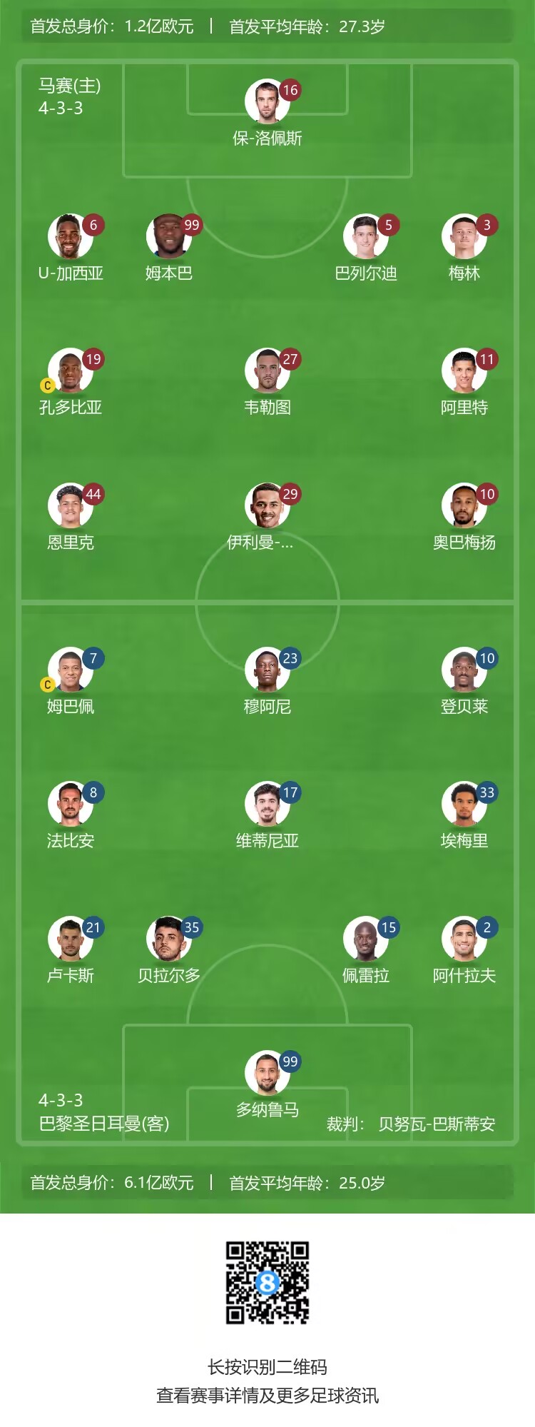 马赛首发:16-保-洛佩斯、3-梅兰、5-巴列尔迪、6-乌利塞斯-加西亚、99-姆本巴、11-阿里特、19-孔多比亚、27-韦勒图、29-恩迪亚耶、10-奥巴梅扬、44-路易斯-恩里克