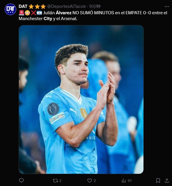 04月01日讯 英超本轮焦点战,曼城主场0-0闷平阿森纳。本场比赛曼城前锋阿尔瓦雷斯替补没有出场。