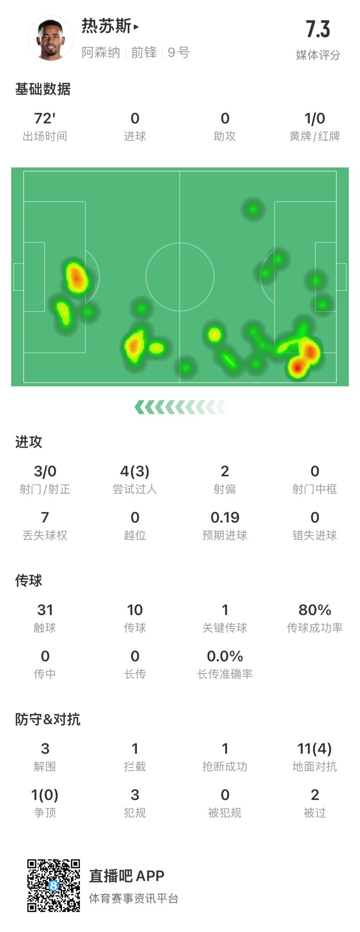 4月1日讯 英超第30轮,曼城对阵阿森纳,阿森纳球员热苏斯首发出战72分钟,赛后获评7.3分,为阿森纳队内最高。