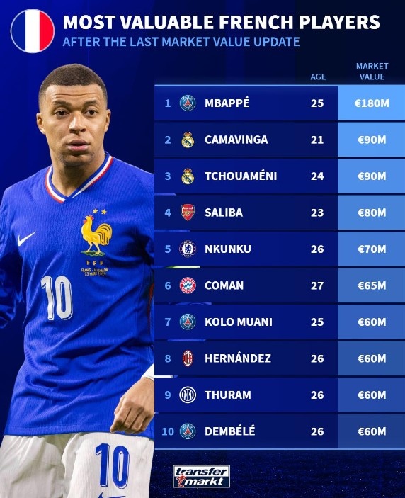 4月1日讯 《转会市场》更新了球员身价,并列出了法国球员身价榜情况,姆巴佩无悬念领跑。