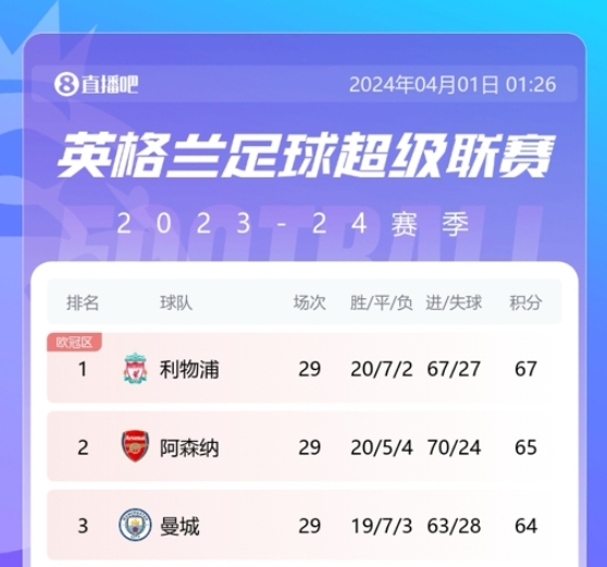 第28轮,利物浦1-1战平曼城,阿森纳坐收渔翁之利,把握争冠主动权。