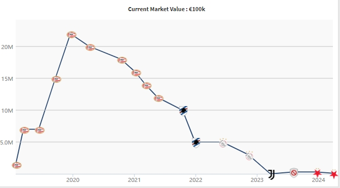 这位曾经的天才少年陨落速度令人唏嘘,他在17岁身价2200万欧,19岁加盟尤文,随后飞速下滑。