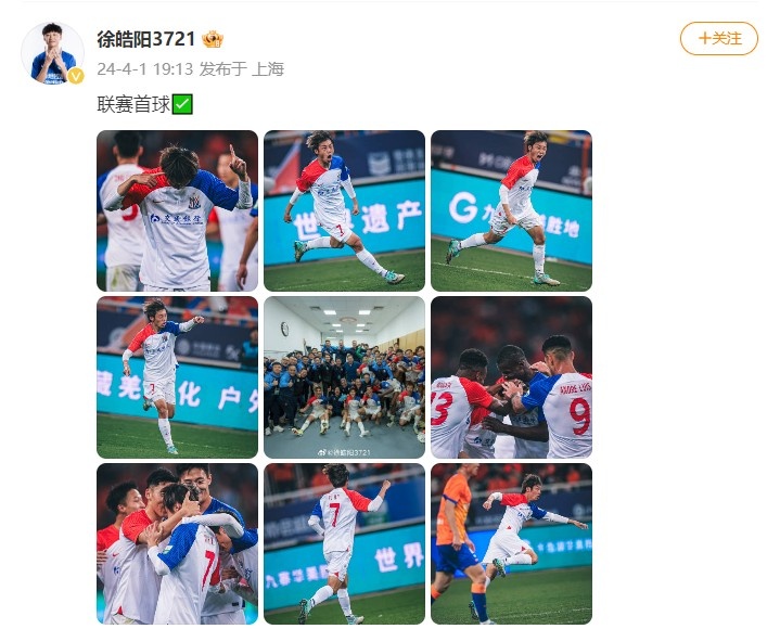 4月1日讯 本轮中超,上海申花3-0客胜山东泰山。此役申花25岁徐皓阳替补登场2分钟打进世界波,收获个人中超首球。今日球员本人也是更新社媒晒照庆祝自己的首球。