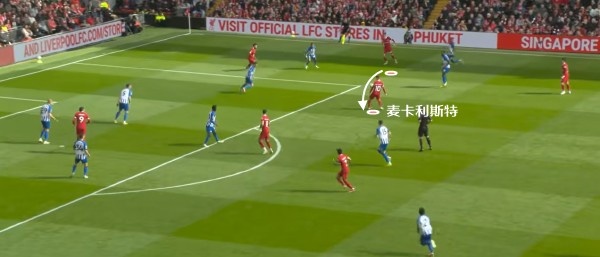 因为利物浦的得分点很多,对方的注意力很容易被分散。所以麦卡利斯特“嵌入”到肋部空位的机会很多,拿球之后,他可以选择传球,也能直接射门。
