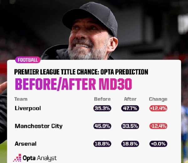 在本轮英超过后,利物浦成为最被看好赢下英超冠军的球队,夺冠几率上升了12.4%。