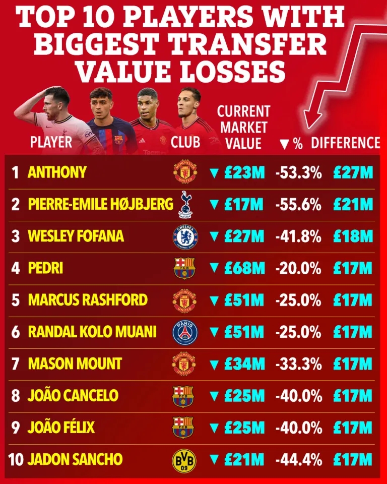 04月01日讯 近期德转更新了各联赛球员身价,太阳报统计了自去年7月1日起,身价下跌最多的10位球员,其中曼联前锋安东尼身价下跌2700万镑排名第一。