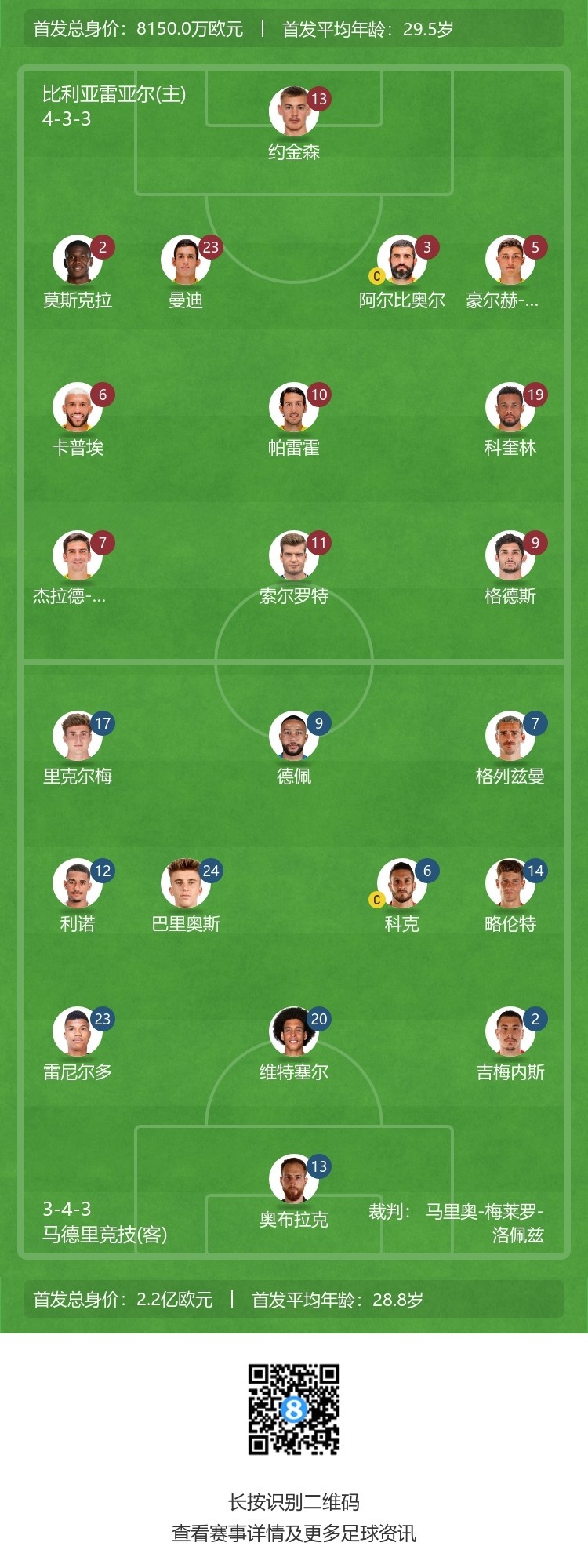 比亚雷亚尔首发:13-约金森、2-莫斯克拉、23-曼迪、3-阿尔比奥尔、5-昆卡、6-卡普埃、10-帕雷霍、19-科奎林、7-杰拉德-莫雷诺、11-索尔洛特、9-格德斯
