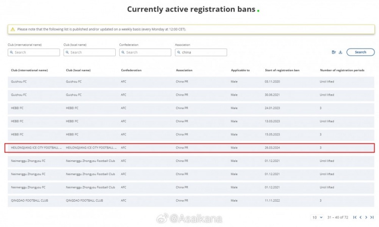 国际足联注册禁令披露系统4月1日例行更新,披露中甲俱乐部黑龙江冰城于3月26日起被处以转会注册禁令,执行期为3个转会窗口,相关案号为FDD-18055 - FPSD-13319。