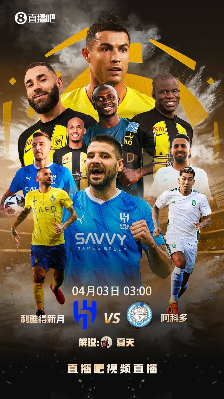 4月2日讯 沙特联第26轮,北京时间4月3日03:00,利雅得新月主场对阵阿科多,将视频直播本场比赛,本场比赛解说由夏天带来。