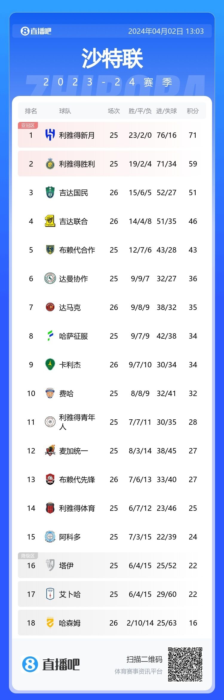 目前在沙特联积分榜上,利雅得新月23胜2负积71高居榜首,领先第二名的利雅得胜利12分。上轮比赛赢球后,利雅得新月又将自身保持的俱乐部最长连胜纪录刷新到了30场。阿可多7胜3平15负积24分排名第15位,队内拥有曾经效力过巴萨的阿莱士-科利亚多等球员。