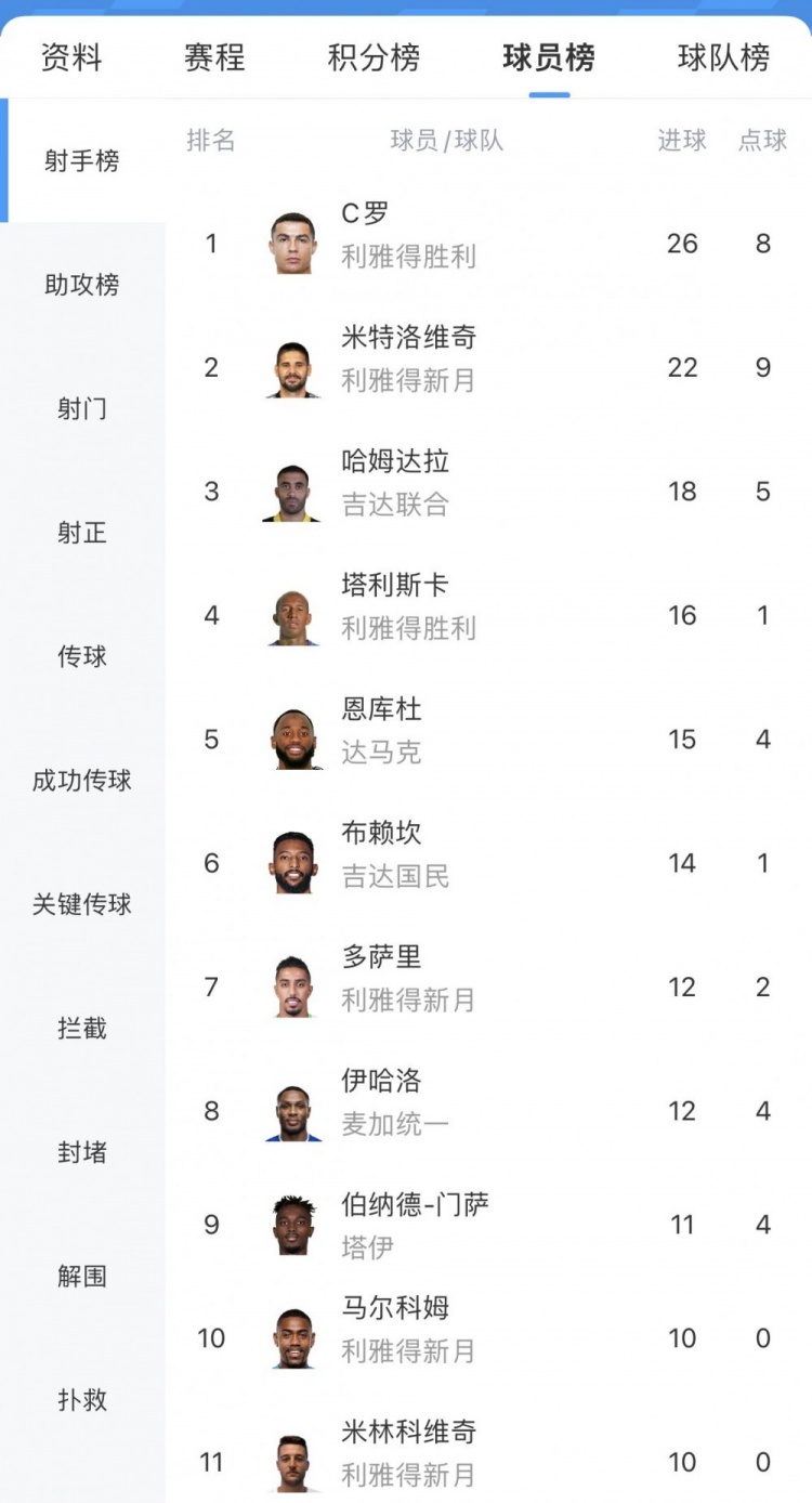 联赛射手榜方面,上轮打入两球的利雅得新月球员米特洛维奇,落后榜首的C罗4球,排名射手榜次席。