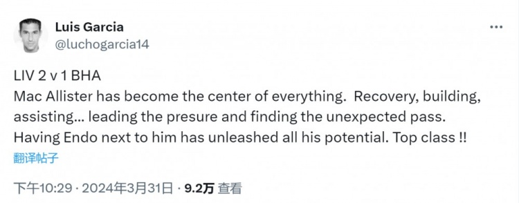 4月2日讯 在英超第30轮比赛中,麦卡利斯特助攻萨拉赫破门,帮助利物浦主场2-1击败布莱顿,前利物浦球星路易斯-加西亚在社交媒体上称赞了这位阿根廷中场的表现。