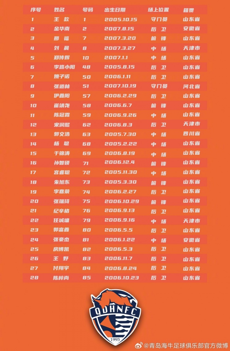 战斗小海牛们!青岛海牛U19梯队大名单出炉,矫春本担任主帅