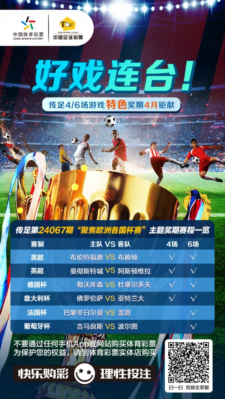 第24067期传足4/6场游戏特色奖期已经于2024年3月31日20:00开售,将于4月3日22:00停售,并于4月4日开奖。其中布伦特福德VS布赖顿,曼彻斯特城VS阿斯顿维拉、勒沃库森VS杜塞尔多夫和佛罗伦萨VS亚特兰大为4场进球游戏竞猜赛事。