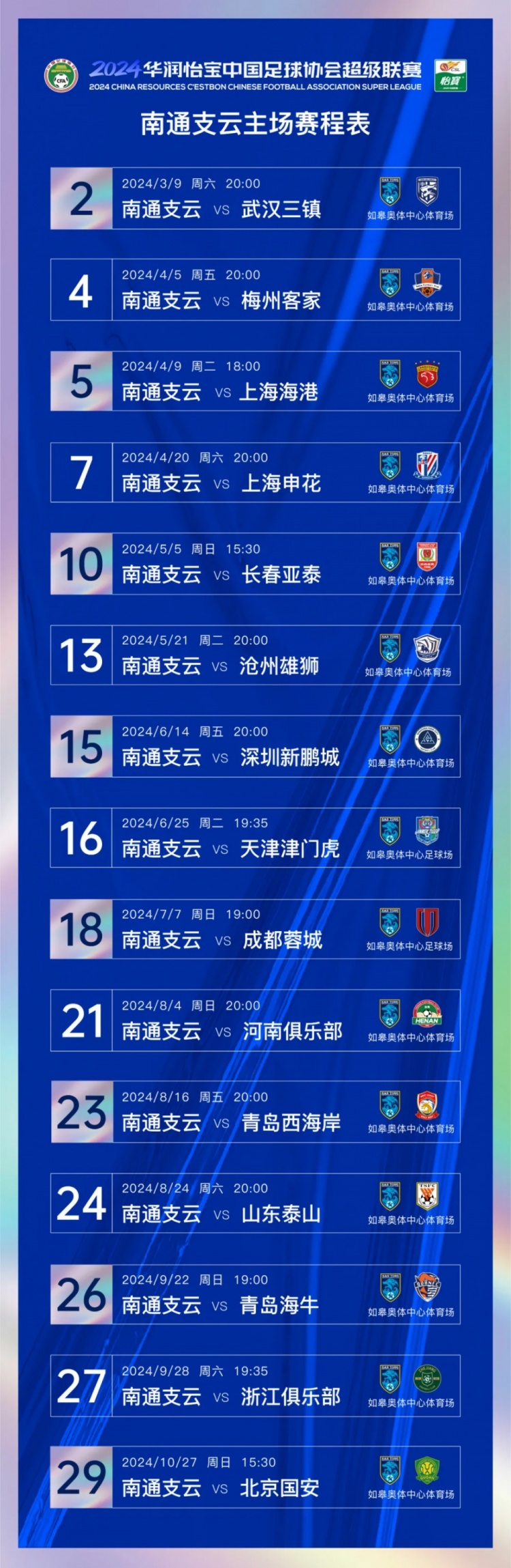 8、观赛球迷需遵守《2024华润怡宝中国足球协会超级联赛[南通支云队主场]观赛须知》。