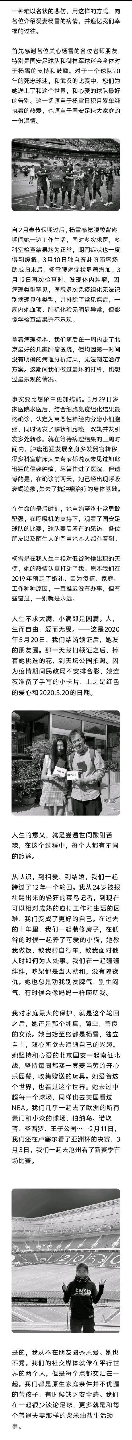 4月3日讯 在国安女球迷杨雪不幸于4月2日去世后,她的丈夫张雅勋在社媒发文,介绍了杨雪生前的病情情况并追忆了他俩的幸福时光。